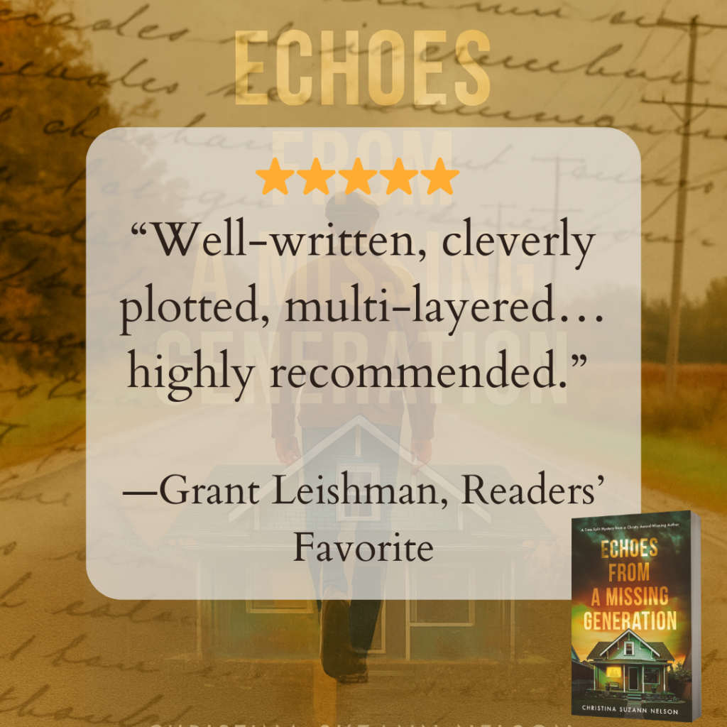 Echoes From a Missing Generation is a fascinating read. This is the first time I have read a split-time, cold case mystery, and it was intriguing. Told from multiple perspectives across a fifty-year time difference, we see Clara and Bristol as a young couple, very much in love, with their life being disrupted by an inconvenient and difficult-to-comprehend foreign war. At the same time, we see Kenzie’s perspective, looking at her grandmother today and marveling at how she had coped with the gossip, innuendo, and finger-pointing of the town after Bristol’s disappearance and yet remained loyal and true to his memory. Christina Suzann Nelson has created a well-written, cleverly plotted, multi-layered mystery that will appeal to a wide variety of readers. I appreciated the tight-lipped manner and loyalty to her husband that Clara displayed over the years, despite the overwhelming evidence to the contrary. Her belief in Bristol’s innocence was paramount, and it would take all Kenzie’s considerable efforts to unravel the truth behind his disappearance. By spreading the story across two distinct time periods, the author has produced more than just a cold case mystery. Her recounting of the family and small-town dynamics of Vietnam-era America reveals a complex social commentary on the viewpoints and discussions that were taking place around the dining tables of most households of the period. This is a heartwarming, yet tragic love story that transcends time and place and reminds us that everything is not always as it seems. An easy and enjoyable read that I highly recommend.